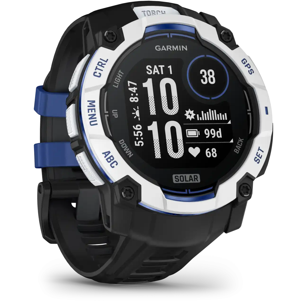 Egy méretes 50mm-es napelemes fehér, kék betétes férfi Outdoor órafekete óraszíjjal, okosóraként unlimited üzemidővel. Navigációja Garmin Explore app-al egyszerű.