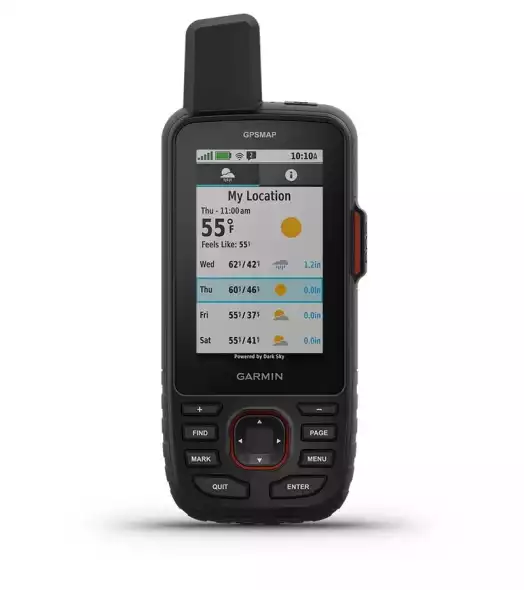 Az inReach kapcsolat segítségével részletes időjárás-frissítéseket kaphatsz a GPSMAP 67i kézi GPS készülékről. Kérj időjárás-előrejelzést az aktuális tartózkodási helyedre, úticéljodra vagy az útvonalon lévő úti célokra vonatkozóan.