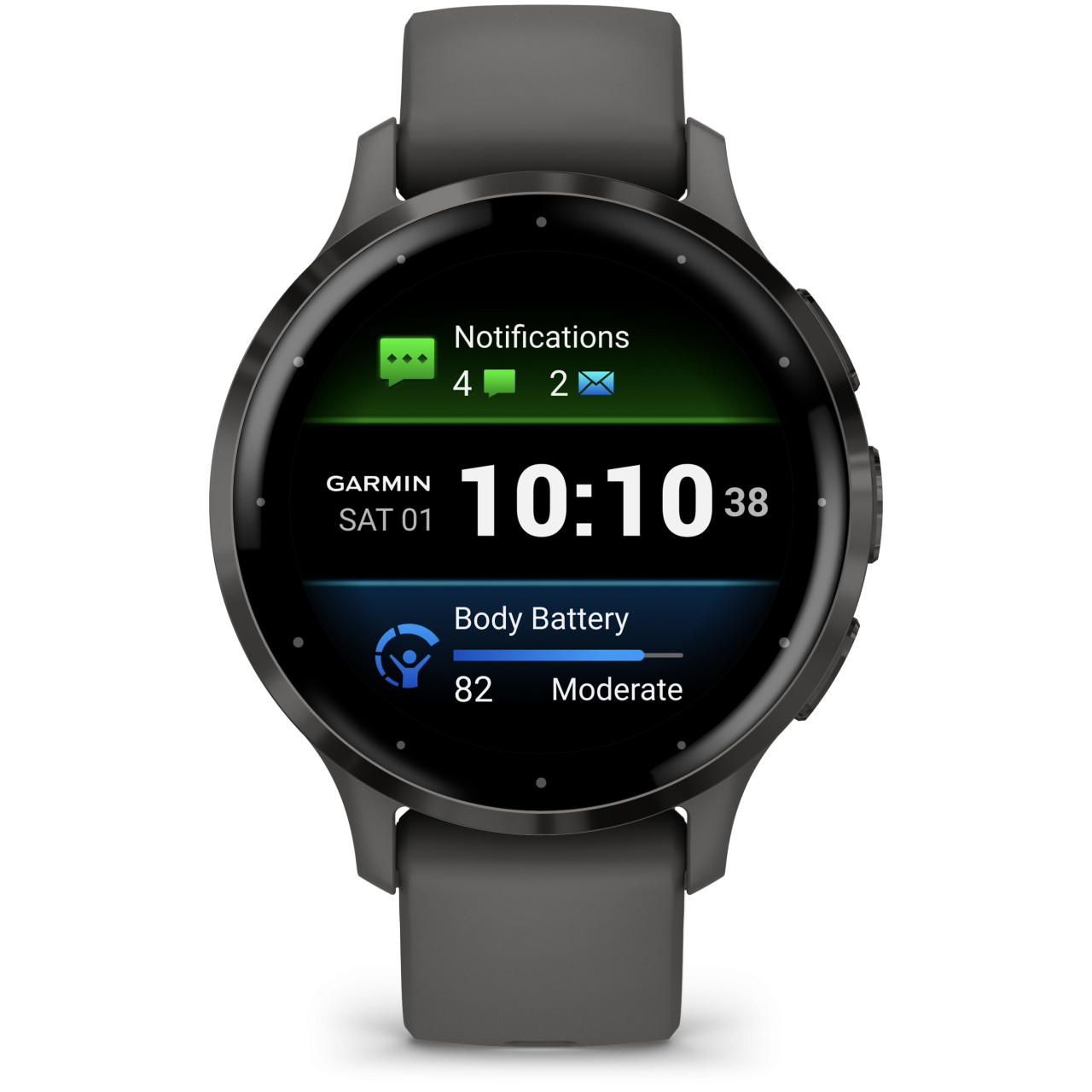 Női méretű méretű Venu 3s rozsdamentes acél palaszürke lünettával, szürke óraszíjjal és óraházzal, palaszürke színű csatal. Emelt alvásmonitorozás, HRV státusz, regenerációs idő