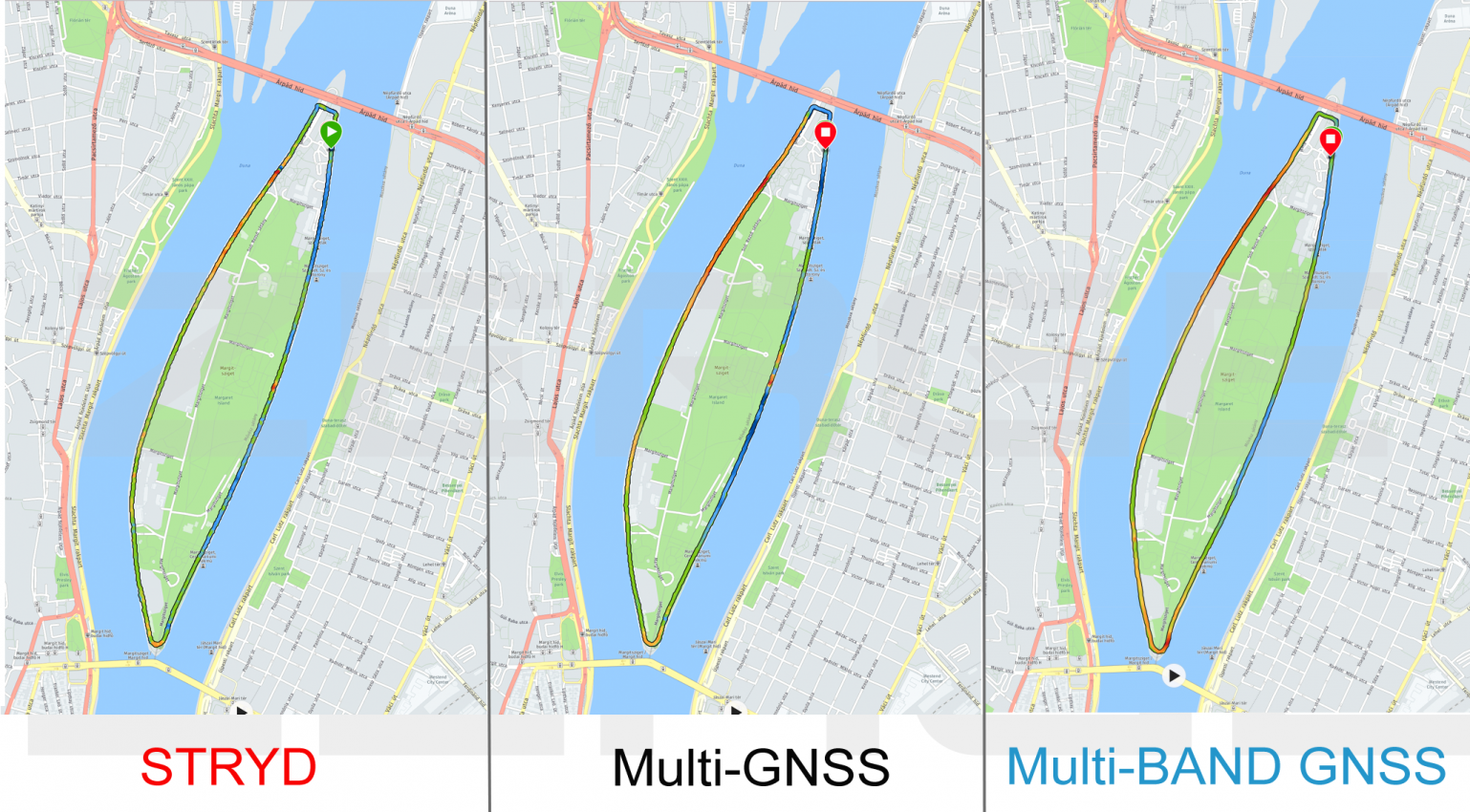 A teszt a Margitszigeten zajlódott, nincsenek magas házak, nincsenek visszaverődő jeltorzulások, nincsenek szurdokok, hasadékok és nagyon magas fák. Tehát ez a tesztünk folytatódik, mert kíváncsiak vagyunk arra, mit mutat a 3 féle mérés terepen és mit mutat magas házak közt.