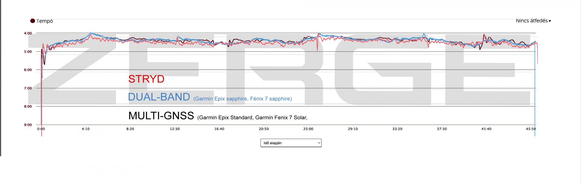 Talán ennek a vonalnak kellett volna a legpontatlanabbnak lenni, de azt láthatjuk, hogy van pár rövidke szakasz, ahol a Multi-GNSS eltér minden más méréstől, nem durva, de látható, hogy hibás jelekből dolgozik. Viszont érzékelte a megtorpanást, s lekövette a piros vonalunkat is gyönyörűen, sőt, elég finoman reagált a tempóváltozásra. összességében van 5% amikor hibás adatai miatt eltér a tempóadat, de ez nem zavaró.