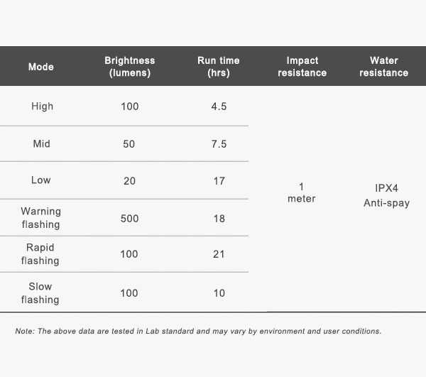 Figyelmeztető villogó üzemmód szemet gyönyörködtető villogó mintázattal és max. 500 lumen fényerővel a nappali láthatóság maximalizálása érdekében; 6 különböző üzemmód a különböző nappali és éjszakai tekeréshez alkalmazkodik a különböző környezetekhez.